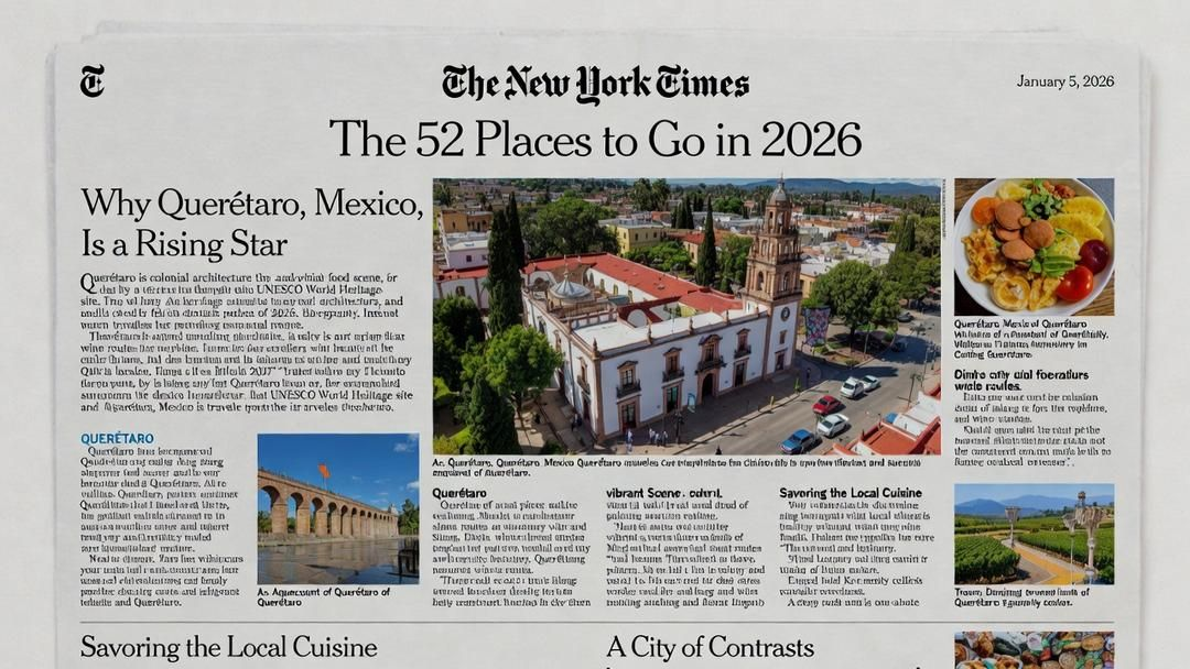 Ciudad mexicana brilla en lista global. Querétaro fue reconocido a nivel internacional al ser incluido por The New York Times en su listado de los “52 lugares para visitar en 2026”, donde ocupa el lugar 35 del ranking. El T...