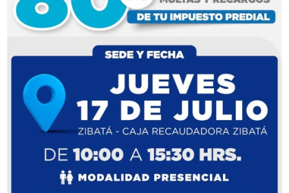 ¡Aprovecha y ponte al corriente! 80% de descuento en multas y recargos de tu impuesto predial. Nos vemos este jueves en Zibatá, de 10:00 a 15:30 horas....